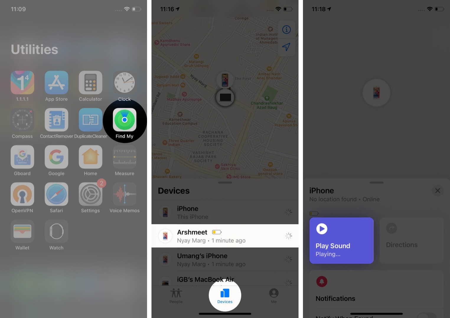 เมื่อกดดูตำแหน่งของ มือถือ iPhone ที่หายไปแล้วจะเห็นได้ว่ามีเมนูตัวช่วยในการค้นหาทั้งการเล่นเสียง (Play Sound) ที่เมื่อกดแล้ว มือถือ iPhone (เครื่องที่หาย) ก็จะส่งเสียงออกมาให้เราสามารถเดินตามหาได้ง่าย ๆ