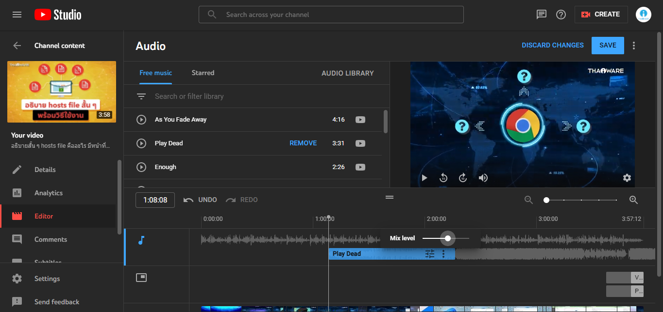 ถ้าอยากจะเพิ่มเพลงประกอบคลิปหรือซาวด์เอฟเฟกต์ภายในคลิปให้ดูน่าสนใจมากยิ่งขึ้นโดยไม่ต้องกังวลเรื่องลิขสิทธิละก็ การเติมเสียงบน YouTube ก็ช่วยได้มากเลยทีเดียว เพราะใน "เมนู Audio" ของ "แท็บ Editor" นั้นมี "Free Music" ให้เลือกใช้งานกันได้แบบฟรี ๆ (กดฟังที่ปุ่มเล่นเพลงก่อนเลือกได้นะ)