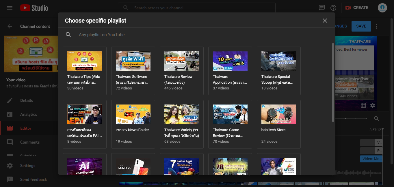 เติม "หน้าต่าง Playlist" แนะนำได้ทั้งการเลือก Playlist ภายในช่องของเราและ Playlist อื่น ๆ บน YouTube (พิมพ์ชื่อ Playlist ที่ต้องการในช่องค้นหาได้เลย)