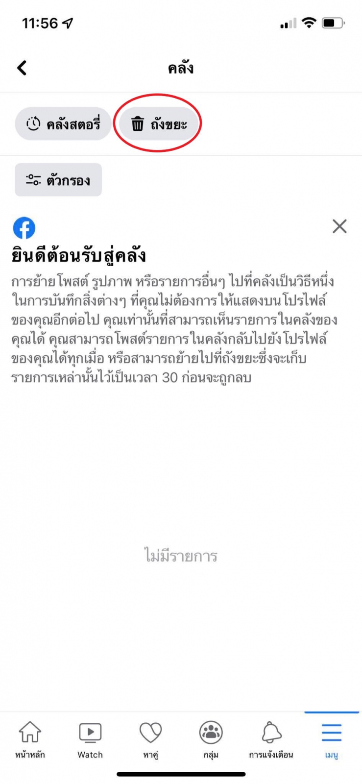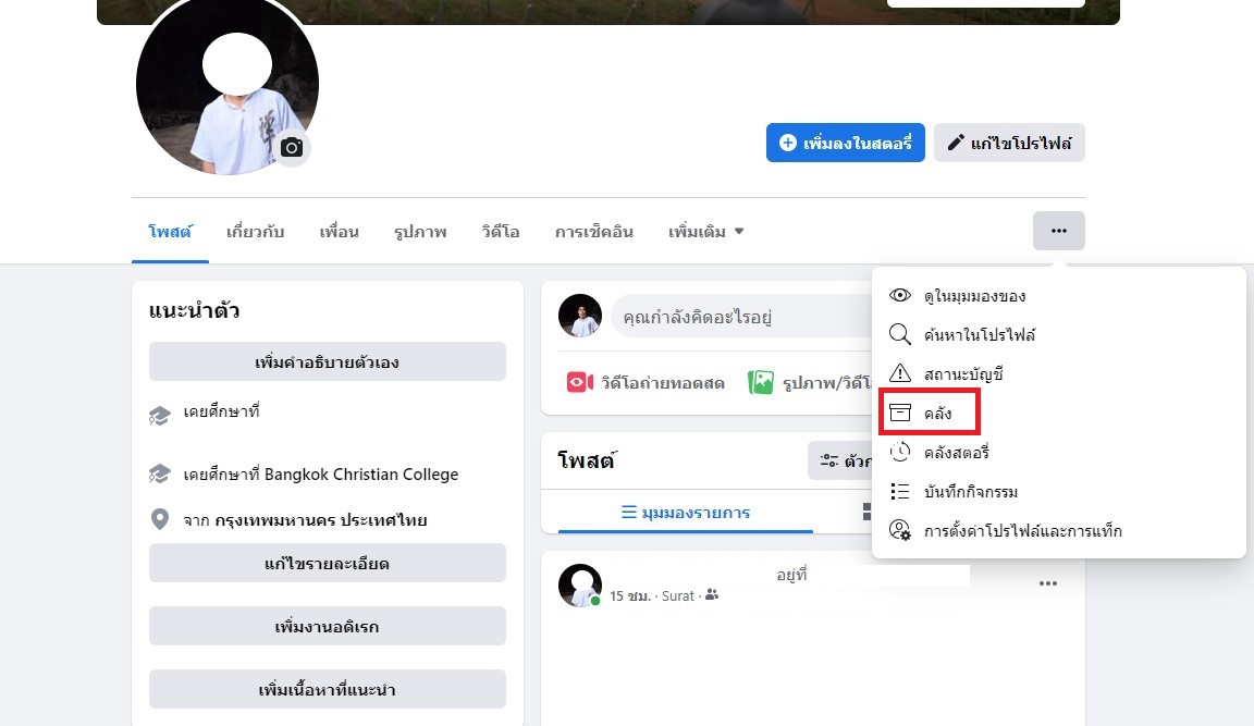 ซึ่งการเข้าไปดูโพสต์ที่เก็บไว้ในคลังก็สามารถไปที่ "เมนู การตั้งค่าโปรไฟล์ (เมนูสามจุด) → เมนู คลัง (Archive)" เหมือนตอนกู้จากถังขยะได้เลยครับ