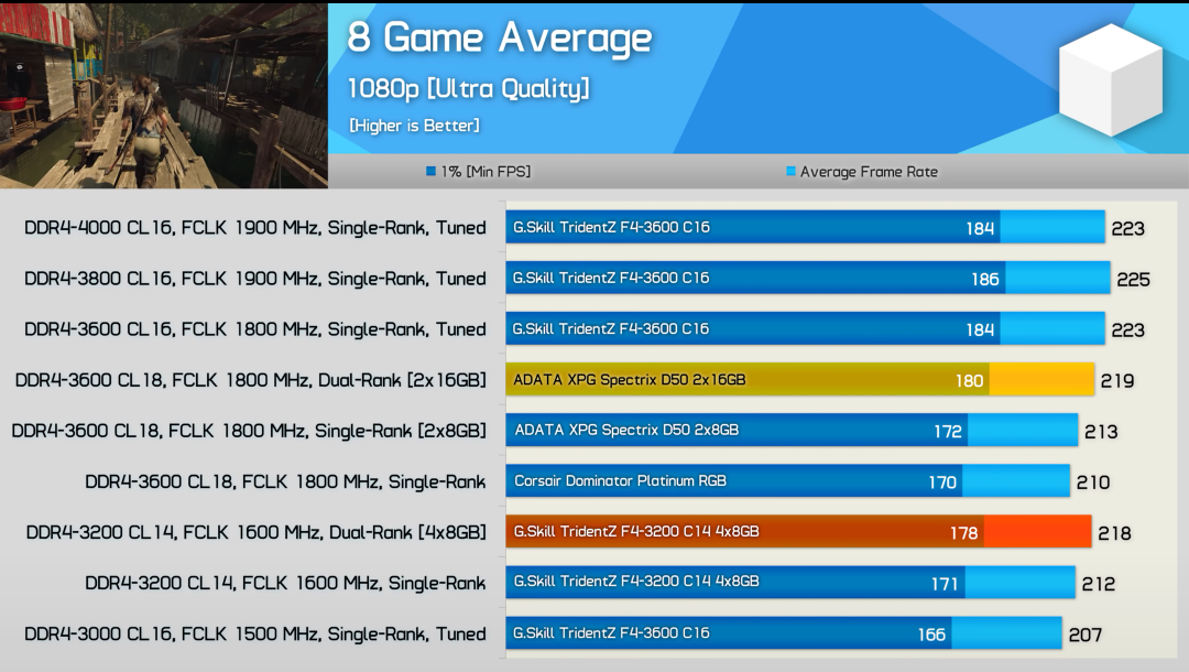 โดยจะยกตัวอย่างการทดสอบ Benchmarks ที่เปรียบเทียบการใช้แรม Single Rank และ Dual Rank เพื่อเล่นเกมในภาพที่ ความระเอียดหน้าจอ 1080p (Full HD) ผลที่ได้ออกมาพบว่าในอัตราความเร็วบัส (MHz) ที่เท่ากันของแรมแต่ละชนิด Dual Rank เหนือกว่าอยู่ 3 - 5 %