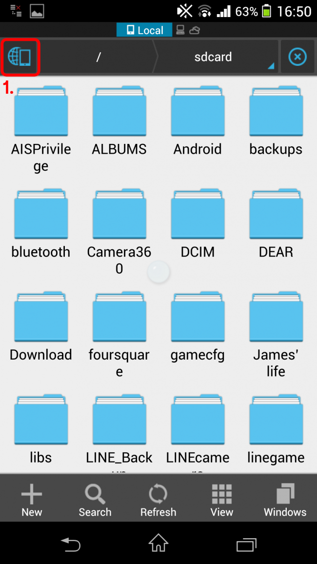 2. พอติดตั้งเสร็จ ก็เปิดแอป ES File Explorer ขึ้นมา พร้อมกับกดที่ไอคอนสมาร์ทโฟนสีฟ้ามุมซ้ายบน