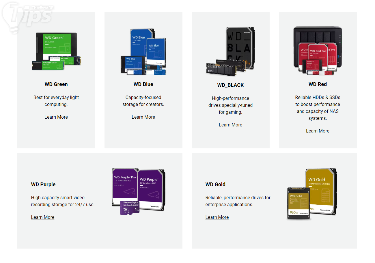 | WD Gold | ใช้เป็นศูนย์ข้อมูลกลางสำหรับองค์กรหรือธุรกิจทั้งขนาดเล็กและใหญ่ | 18 TB. | HDD / NVMe™ SSD | 1 TB. 5,220 บาท |