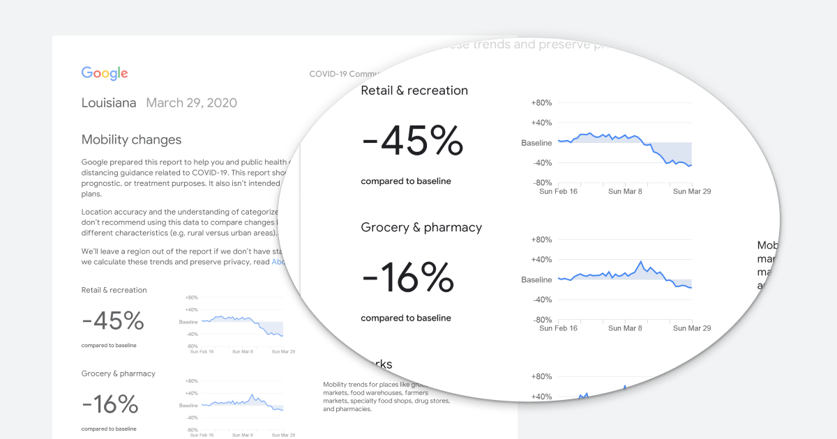 ด้านบนเป็นตัวอย่าง ของ Google ที่เผยแพร่สถิติจากข้อมูล "Mobility Data" ในช่วงที่เกิดไวรัสระบาดในแต่ละวัน หรือตามภาพคือวันที่ 20 มีนาคม พ.ศ. 2563 (ค.ศ. 2020) โดยข้อมูลเหล่านั้นก็บ่งบอกถึง สถานที่ที่ผู้คนกระจุกตัวกันอยู่ในช่วงที่เกิดการแพร่ระบาดพอดี เช่น ร้านขายของชำ, สวนสาธารณะ, ห้างสรรพสินค้า, ออฟฟิศ หรือสถานที่ทำงาน, สถานีขนส่ง เป็นต้น ซึ่งข้อมูลเหล่านี้ สามารถเอามาใช้ประเมินสถานการณ์ได้