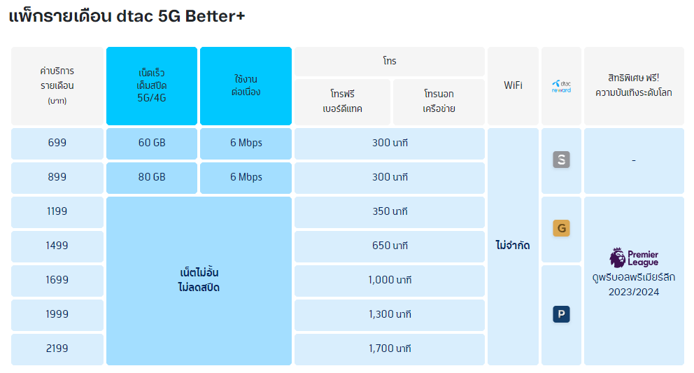 | แพ็กเกจเริ่มต้นถูกที่สุด | 488 บาท / เดือน โปรโมชัน 3BB เวลคัม | 699 บาท / เดือน แพ็กเกจ dtac 5G Better | 599 บาท / เดือน ลูกค้าปัจจุบัน ลูกค้าใหม่ ลูกค้าเปลี่ยนเติมเงินเป็นรายเดือน ลูกค้าย้ายค่ายออนไลน์ |