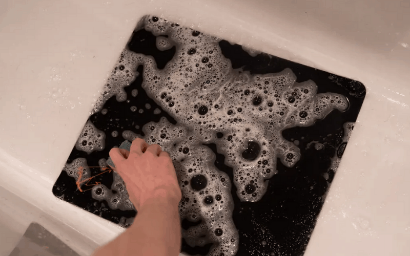 - แช่แผ่นรองเมาส์ลงในอ่าง จากนั้นใช้มือหรือฟองน้ำถูหรือขยี้ซักบริเวณด้านบนของแผ่นรองเมาส์ อาจต้องใช้แรงเพิ่มสักหน่อยสำหรับคราบฝังแน่น
