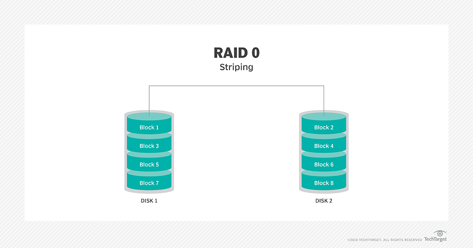 RAID 0 เป็นการทำงานแบบ Striping (ทำให้เป็นริ้วๆ หรือชิ้นเล็กๆ) นั่นหมายความว่า ข้อมูลจะถูกย่อยให้เป็นก้อนข้อมูลขนาดเล็ก (Block) ก่อนที่จะกระจายไปเก็บบนฮาร์ดไดร์ฟทุกตัวในระบบ เมื่อระบบต้องการใช้งานข้อมูลดังกล่าว มันจะดึงข้อมูลจากทุกฮาร์ดไดร์ฟมารวมกันเป็นข้อมูลเดิม โดยการทำแบบนี้จะทำให้ความเร็วในการอ่าน/เขียนข้อมูล เร็วขึ้นกว่าเดิมมาก