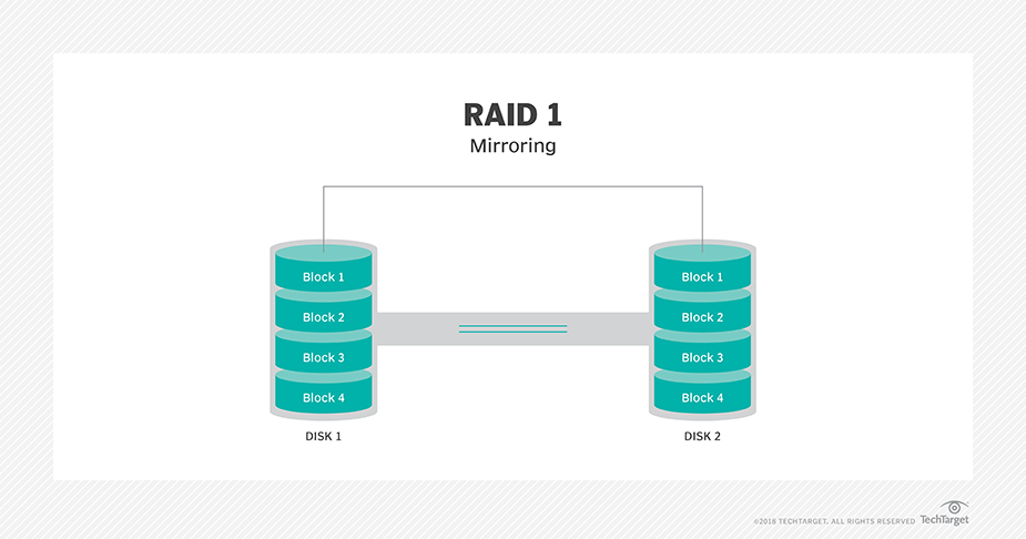 RAID 1 ใช้หลักการทำงานแบบ Mirroring (แบบเงา) ข้อมูลจะถูกทำสำเนาเก็บแยกลงบนฮาร์ดไดร์ฟคนละตัว หากไดร์ฟตัวหนึ่งเกิดความเสียหาย ก็ยังสามารถเรียกข้อมูลจากไดร์ฟสำรองได้ ในส่วนของประสิทธิภาพในการอ่านข้อมูลก็ถือว่าทำได้ดี เพราะมันก็ใช้เทคนิคย่อยข้อมูลกระจายออกเป็น Blocks เหมือนกับ RAID 0