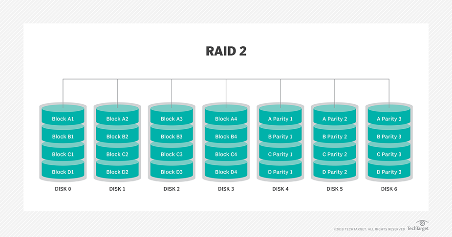 RAID 2 เป็นมาตรฐาน RAID ที่มีประสิทธิภาพในการอ่านเขียนข้อมูลสูงมาก โดยตัวควบคุม (Controller) พิเศษที่จะคอยประสานทิศทางการหมุนของฮาร์ดไดร์ฟให้เท่ากัน เพื่อให้สามารถเข้าถึงตำแหน่งข้อมูลของข้อมูลที่ถูกกระจายอยู่ได้ในเวลาเดียวกัน