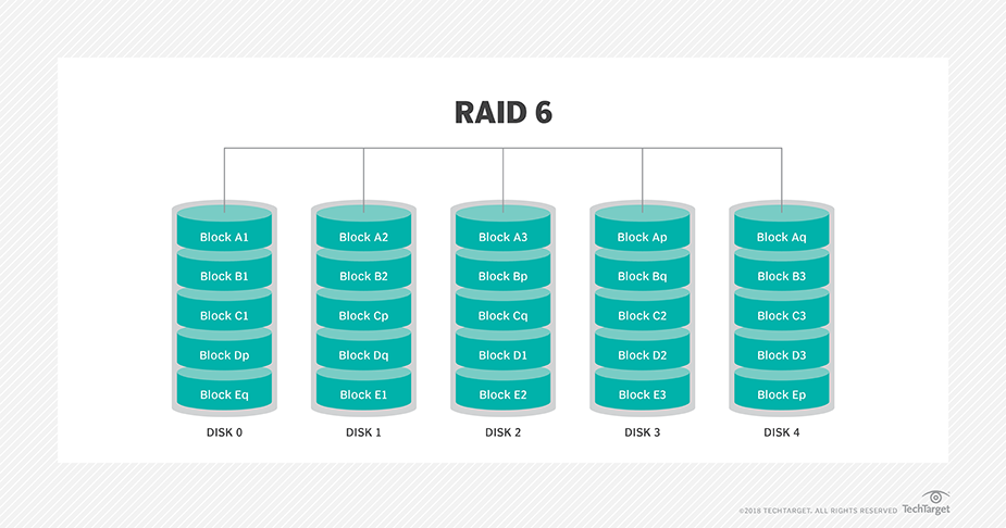 RAID 6 ออกแบบมาเพื่อแก้ไขปัญหาของ RAID 5 ด้วยการเพิ่มจำนวน Block สำหรับเก็บไฟล์ Parity ขึ้นเป็น 2 Blocks เพื่อเพิ่มประสิทธิภาพในการกู้คืนระบบทำได้ดียิ่งขึ้น อย่างไรก็ตาม มันก็มีข้อเสียตรงที่ RAID 6 จะมีประสิทธิภาพในการเขียนข้อมูลได้ช้ากว่า RAID 5