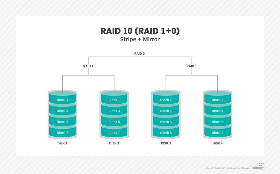การผสมผสานระหว่าง RAID 1 และ RAID 0 จะเรียกว่า RAID 10 ที่ข้อมูลจะมีการทำสำเนาเหมือน RAID 1 และตัวสำเนาจะถูกกระจายออกไปเหมือน RAID 0