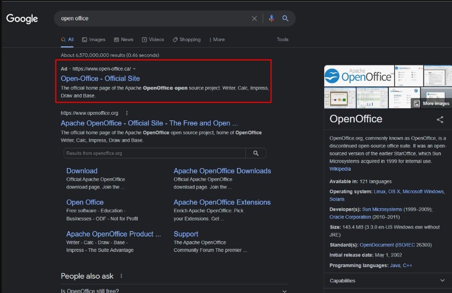 ซึ่งพอเหยื่อพยายามค้นหาเว็บไซต์ดังกล่าวบน Google ก็จะเจอกับเว็บปลอมขึ้นมาติดการค้นหาควบคู่กับของจริง เหยื่อที่ไม่ได้ตรวจสอบให้ดี ก็หลงไปอยู่ในเว็บไซต์ปลอมและเผลอดาวน์โหลดมัลแวร์มาแทนที่จะเป็นโปรแกรม OpenOffice