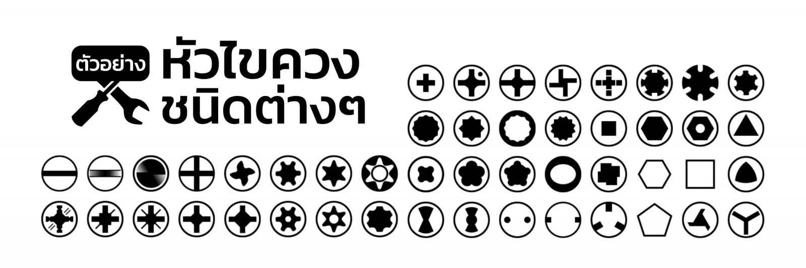 มารู้จักกับ 6 ประเภทหลัก ของไขควงที่เราพบเห็นและใช้งานได้บ่อย ๆ กันก่อน โดยรูปด้านล่างนี้จะเป็นสัญลักษณ์เปรียบเทียบหัวไขควงและหัวสกรูที่ใช้งานร่วมกันแต่ละรูปแบบ โดยจะมีชื่อเรียกดังนี้