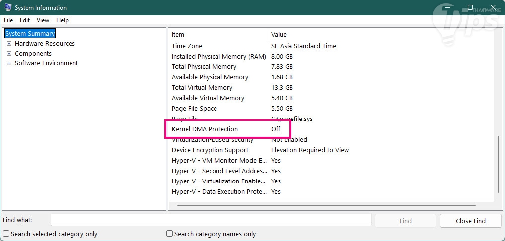 เราสามารถตรวจสอบสถานะการทำงานของ Kernel DMA Protection ได้ด้วยขั้นตอนดังนี้