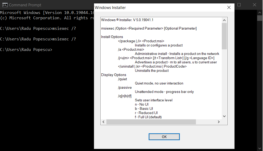 แน่นอนว่า .MSI ก็รองรับการทำ "Silent Install" ด้วยเช่นกัน โดยถูกกำหนดมาเป็นค่าเริ่มต้นตั้งแต่แรกเลย เราสามารถตรวจสอบการทำงานของมันผ่าน Command Prompt ด้วยคำสั่ง "msiexec /?"