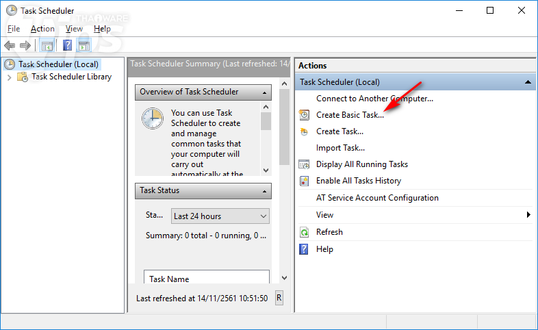 ใน Windows นั้น ที่จริงก็มีเครื่องมือตั้งเวลาการทำงานเอาไว้ให้ใช้นะ เรียกใช้ด้วยการคลิกปุ่มเมนู Start (อยู่มุมขวาล่างของหน้าจอ) แล้วพิมพ์ลงไปว่า Task Scheduler เมื่อเปิดโปรแกรมขึ้นมาแล้ว คลิกไปที่เมนู Create Basic Task