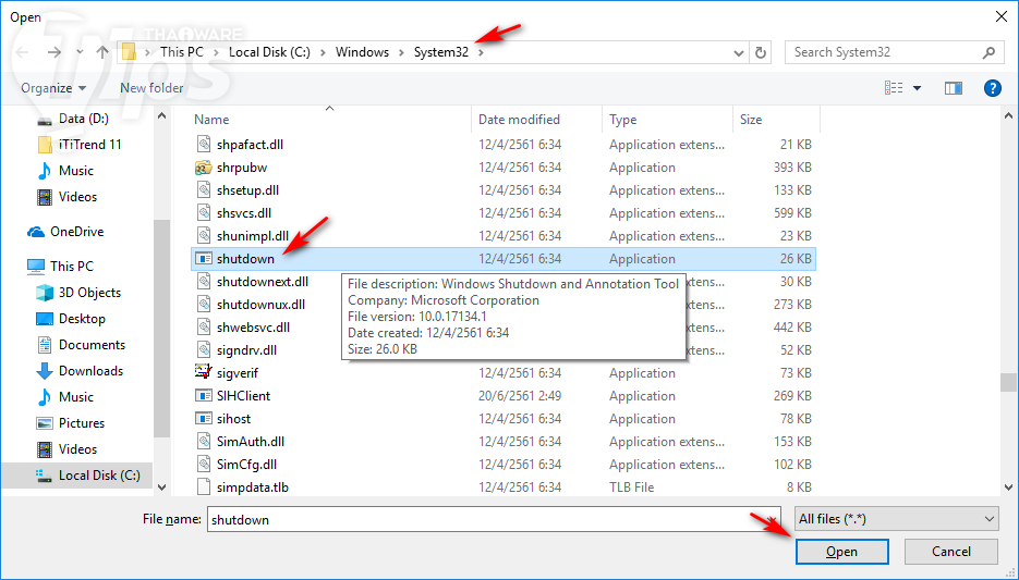 จะเห็นช่อง Program/script: พิมพ์ลงไปว่า C:\Windows\System32\shutdown.exe หรือจะคลิกปุ่ม Browse... แล้วไปที่ C:\Windows\System32 เลื่อนหาโปรแกรมที่มีชื่อว่า shutdown คลิกเลือก แล้วคลิกปุ่ม Open ก็ได้