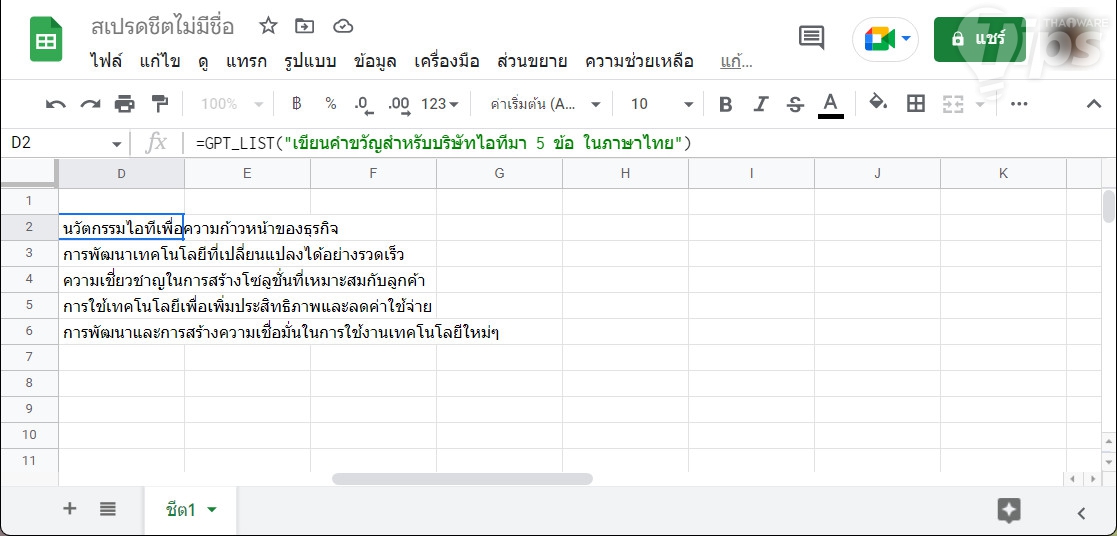 "=GPT_LIST("เขียนคำขวัญสำหรับบริษัทไอทีมา 5 ข้อ ในภาษาไทย")" ทั้งนี้ถ้าไม่ระบุว่าเป็นภาษาไทย ตัว ChatGPT จะสร้างออกมาเป็นข้ออความภาษาอังกฤษ แน่นอนว่าหากต้องการคำตอบเป็นภาษาอื่นก็ทำได้เช่นกัน