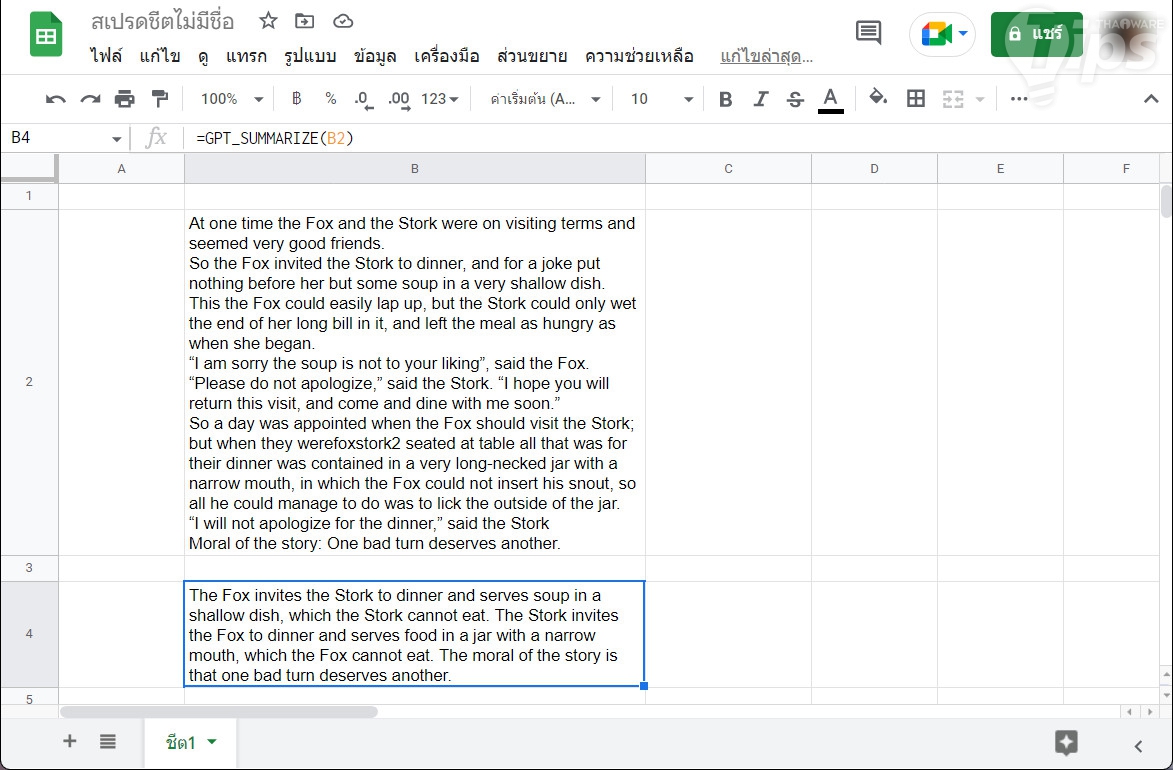 อย่างไรก็ตาม การสร้างข้อความในรูปแบบนี้ ไม่ค่อยมีประโยชน์กับการใช้งานบน Google Sheets สักเท่าไหร่ และทำงานได้ช้ากว่าการใช้งานบนเว็บ ChatGPT โดยตรงอีกด้วย