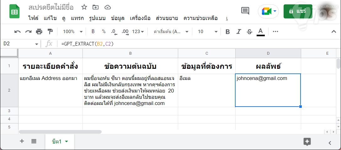 และนี่ก็เป็นหนึ่งในคำสั่งของ ChatGPT ที่เราคิดว่าเจ๋งมาก โดยถ้าข้อมูลภายใน Cell ประกอบด้วยข้อมูลสำคัญหลายอย่าง เราสามารถใช้ ChatGPT ช่วยจำแนกข้อมูลออกมาใน Cell ที่ต้องการได้ง่าย ๆ ด้วยคำสั่ง "=GPT_EXTRACT"