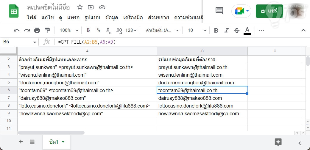 อีกสักตัวอย่าง คราวนี้เราจะใช้ GPT_FILL ในการจัดระเบียบข้อมูลอีเมล ก็ทำเหมือนเดิม กำหนด Cell อ้างอิง และ Cell ที่ต้องการจัดระเบียบข้อมูล ลองไปประยุกต์ใช้กันดู ที่น่าจะได้ใช้บ่อย ๆ ก็อย่างเช่น การเปลี่ยนรูปแบบวันเดือนปี, การแยกเอาแต่ชื่อ หรือนามสกุล เป็นต้น