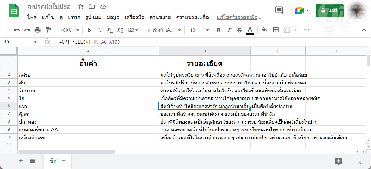 ตัวอย่างสุดท้ายในการใช้ GPT_FILL ที่เราอยากให้ลองนำไปประยุกต์ใช้งานกัน จะเป็นการเพิ่มรายละเอียดข้อมูลต่าง ๆ อย่างเช่น ถ้าเรามีสินค้าที่ต้องระบุรายละเอียดด้วย เราก็คิดแค่เพียง 2-3 รายการเป็นตัวอย่างเอาไว้ จากนั้นก็ให้ ChatGPT ทำงานส่วนที่เหลือต่อได้เลย