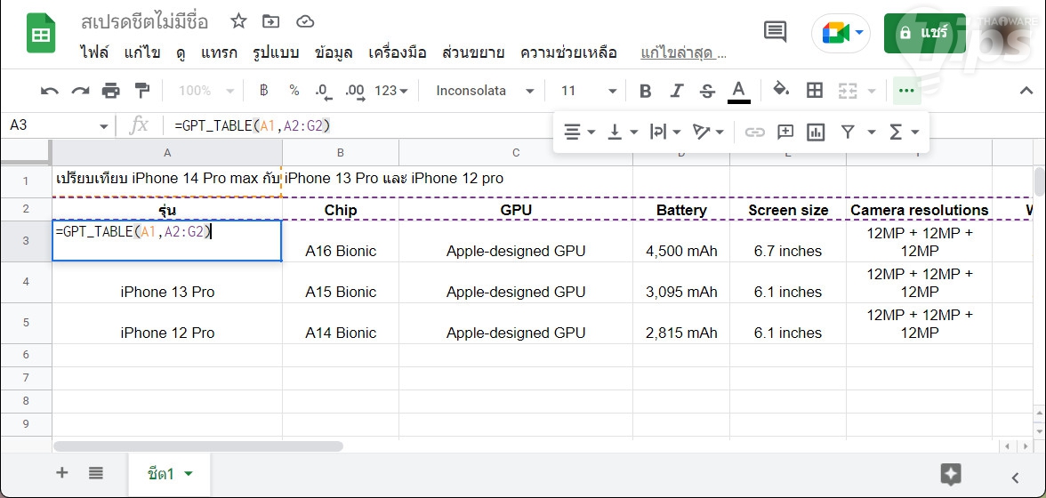 ทีนี้มาลองดูงานที่มีความซับซ้อนมากขึ้นกัน โดยเราตั้งโจทย์เอาไว้ที่ Cell และคอลัมม์ที่ต้องการให้มันใส่ข้อมูลให้ ในตัวอย่างด้านล่างนี้ โจทย์คือต้องการเปรียบสเปกของ iPhone 3 รุ่น โดยใช้สูตร "=GPT_TABLE(โจทย์,ข้อมูลที่ต้องการ)" ก็ได้เป็น "=GPT_TABLE(A1,A2:G2)"
