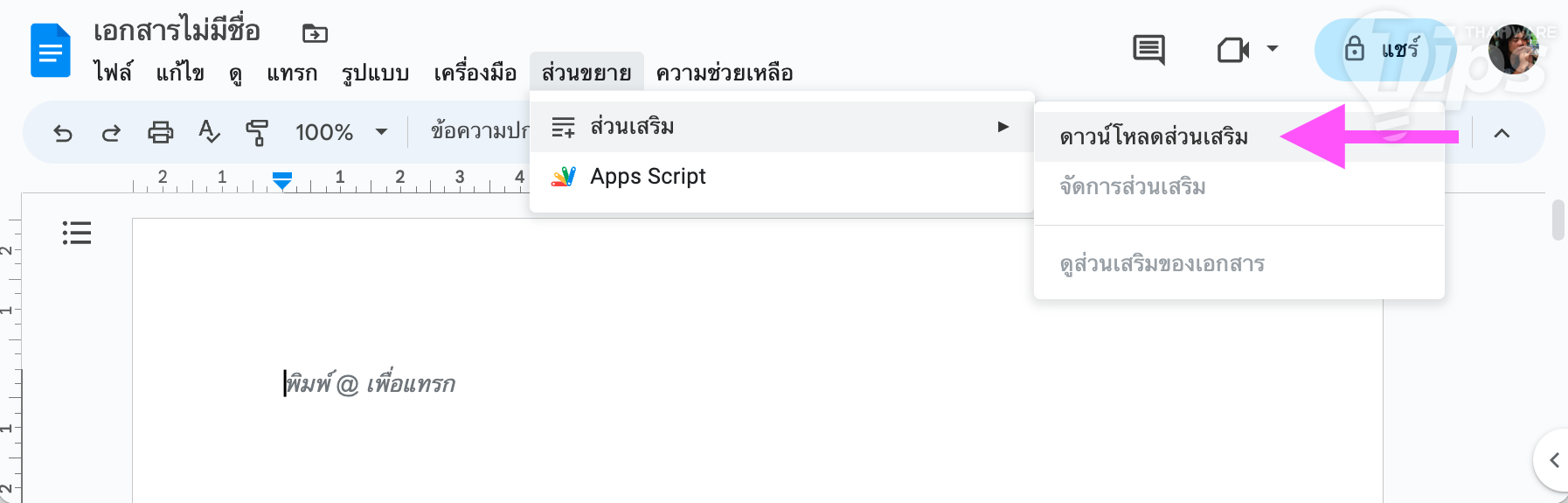 ในการเพิ่มส่วนขยาย GPT for Sheets and Docs ให้ Google Docs ให้เราเริ่มจาก