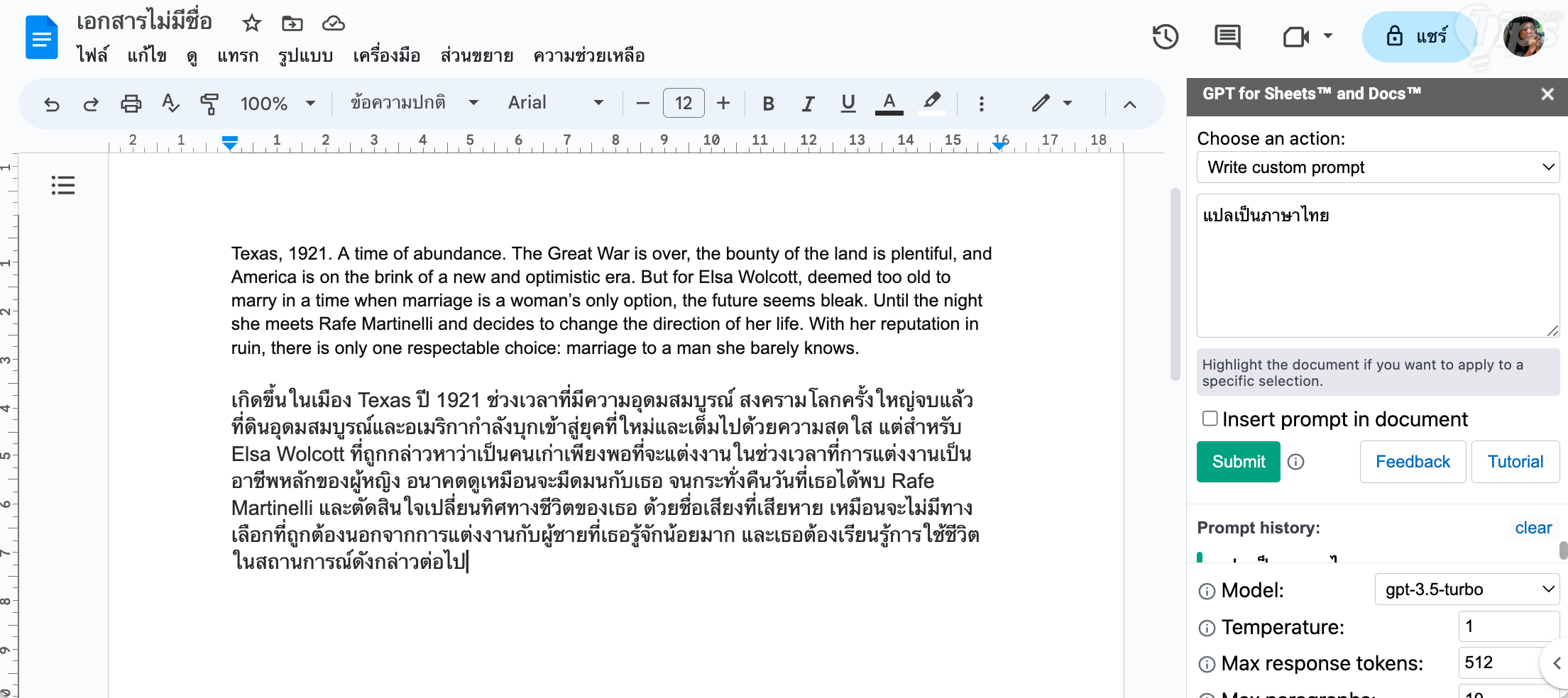 ความสามารถในการแปลภาษาของ ChatGPT ทำออกมาได้ค่อนข้างธรรมชาติกว่า Google Translate พอสมควร การที่แปลได้โดยตรงใน Google Docs มันก็ช่วยการแปลงานง่ายขึ้นเยอะ