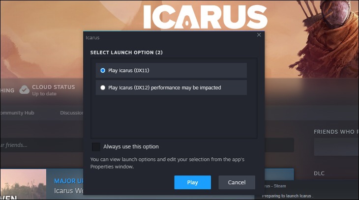 บางเกมจะมีให้ผู้เล่นเลือกได้ว่าจะเล่นด้วย DirectX เวอร์ชันไหน ในภาพคือเกม Icarus