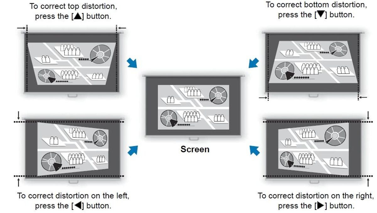 ตามปกติแล้ว โปรเจคเตอร์จะมีมุมที่สามารถฉายภาพออกมาได้เป็นสี่เหลี่ยมอย่างสมบูรณ์แบบอยู่โดยที่ไม่ต้องปรับค่าอะไรเลย อย่างไรก็ตาม ในการใช้งานจริง เราไม่ได้ หรือไม่สามารถที่จะวางโปรเจคเตอร์ในตำแหน่งที่ว่าได้ เพราะมันอาจจะติดสิ่งกีดขวาง หรือเป็นตำแหน่งที่ทำให้ห้องดูไม่สวยงาม ซึ่งความสูง, ความห่าง, องศาของตัวเครื่อง ที่มีความเป็นไปได้มากมาย ทำให้ภาพที่ฉายออกมามักจะออกมาเป็นรูปสี่เหลี่ยมขนมเปียกปูน ซึ่งอาการนี้จะเรียกว่า "Keystone Effect"