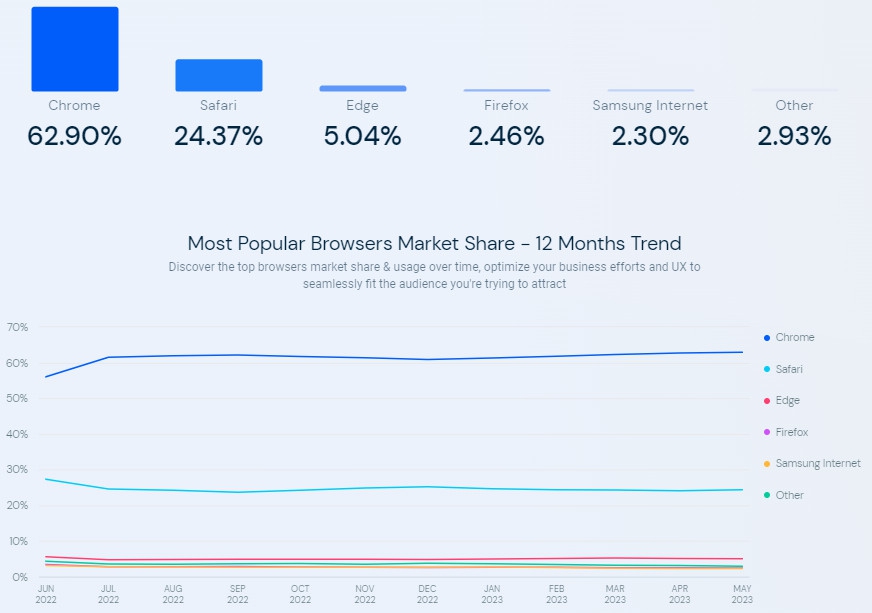 เว็บเบราว์เซอร์ Chrome มาพร้อมกับระบบอัปเดตเวอร์ชันแบบอัตโนมัติ แต่ถึงจะบอกว่าฟรี ในความเป็นจริง ทาง Google ก็มีการเก็บข้อมูลพฤติกรรมการใช้งานจากผู้ใช้เป็นค่าแลกเปลี่ยนแทนเงิน เว็บเบราว์เซอร์ Chrome นั้นประสบความสำเร็จเป็นอย่างมาก ครองตำแหน่งมีส่วนแบ่งในตลาดเว็บเบราว์เซอร์อันดับหนึ่งมาอย่างยาวนาน จนกลายเป็นพื้นฐานการทำงานของนักพัฒนาเว็บไซต์ไปแล้วว่า หน้าเว็บจะต้องแสดงผลได้อย่างถูกต้องบนเว็บเบราว์เซอร์ Chrome เป็นลำดับแรก