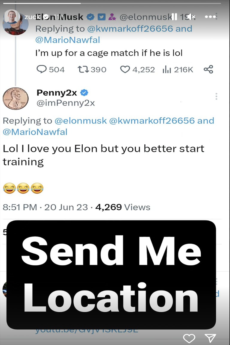 ภาพจาก https://nypost.com/2023/06/22/mark-zuckerberg-accepts-elon-musks-cage-fight-send-me-the-location/