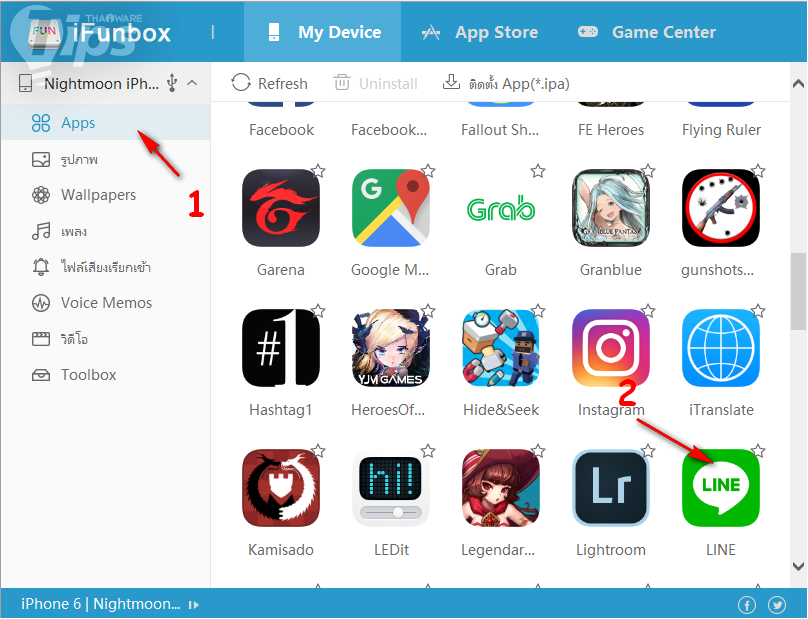 เชื่อมต่อ iPhone เข้ากับคอมพิวเตอร์ให้เรียบร้อย แล้วเปิดโปรแกรม iFunbox ขึ้นมา ที่แท็บ My Device หน้าต่างฝั่งซ้ายเลือก Apps แล้วฝั่งขวาตรงช่อง All My Apps เลือกไปที่แอป LINE (อย่าลืมติดตั้งทวีค Apple File Conduit "2" จากใน Cydia ให้เรียบร้อย ไม่งั้นมันจะเข้าไม่ได้ครับ)