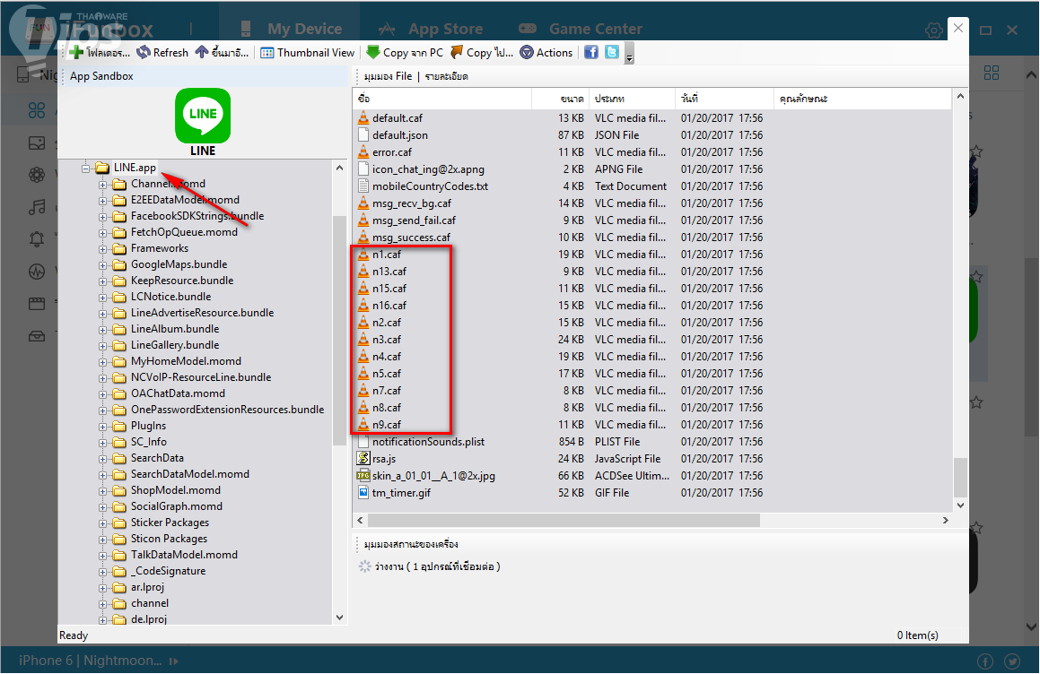 ที่หน้าต่างฝั่งซ้าย คลิกไปที่โฟลเดอร์ LINE.app จากนั้นมองหาไฟล์ n1-n9.caf ที่หน้าต่างฝั่งขวา ไฟล์พวกนี้ คือ ไฟล์เสียงแจ้งเตือนเดิมๆ นั่นเอง เราต้องนำไฟล์เสียงใหม่ที่เราสร้างขึ้นมาเปลี่ยนชื่อให้เป็น n1-n9 ตามที่เราต้องการ แล้วนำมาใส่แทนเพื่อเปลี่ยนเสียง