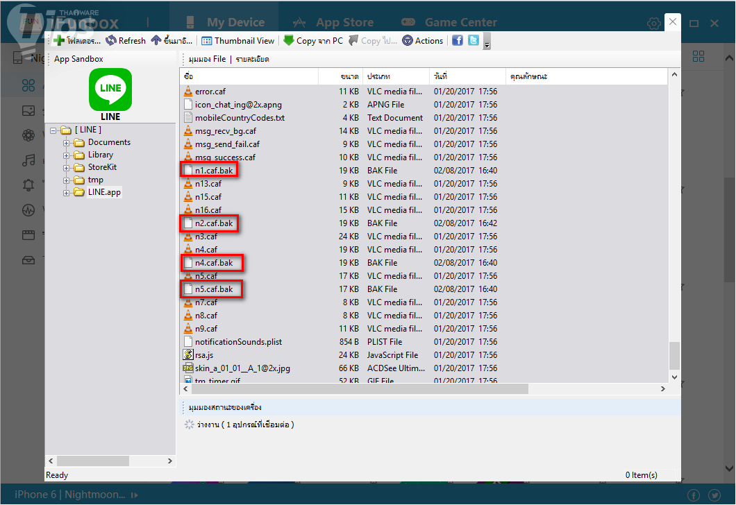 ผมแก้ชื่อไฟล์เดิมจาก n(x).caf ให้เป็น n(x).caf.bak เพื่อสำรองเอาไว้ เผื่ออยากกลับมาใช้เสียงเดิม ในกรณีที่กดเปลี่ยนชื่อใน iFunbox ไม่ได้ ให้ทำการ Copy ไฟล์มาไว้บนคอมพิวเตอร์ แล้วแก้ชื่อไฟล์ เสร็จแล้วค่อยทำการ Copy ใส่กลับเข้าไปอีกครั้ง