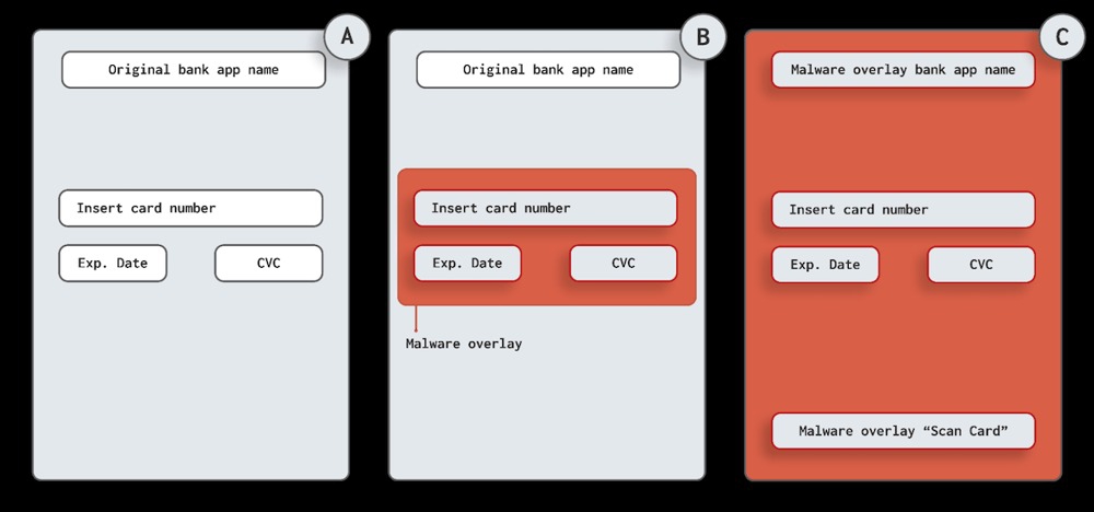ในอดีต การโจมตีแบบ Overlay Attacks ด้วยการอาศัยช่องโหว่ของระบบปฏิบัติการ Android ที่อนุญาตให้แฮกเกอร์สามารถแสดงหน้าต่าง Pop-ups ปลอมขึ้นมาแทนที่เหนือหน้าต่าง Pop-ups ของจริงได้ ทำให้เหยื่อหลงเชื่อ แตะกรอกข้อมูลลงไปในหน้าต่างปลอมดังกล่าว หรือไม่ก็หลอกให้กดอนุญาตการเข้าถึงข้อมูลสำคัญ ซึ่งเทคนิคนี้ก็ยังเป็นที่นิยมของแฮกเกอร์มาจนถึงปัจจุบัน