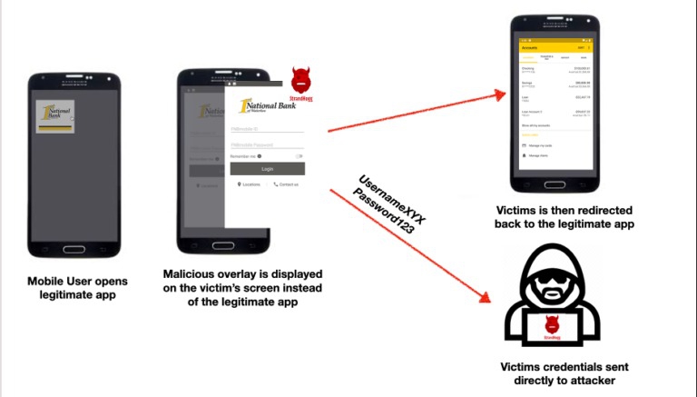 เมื่อผู้ใช้ให้อำนาจแอปพลิเคชันที่มีมัลแวร์แฝงอยู่ มันจะแอบทำงานอยู่เบื้องหลังอย่างเงียบ ๆ รอคอยเวลาที่ผู้ใช้เปิดใช้งานแอปพลิเคชันเป้าหมายขึ้นมา ที่แฮกเกอร์นิยมเล็งเป้าเอาไว้ก็คือ แอปพลิเคชันธนาคาร หรือไม่ก็แอปพลิเคชันโซเชียลเน็ตเวิร์ก