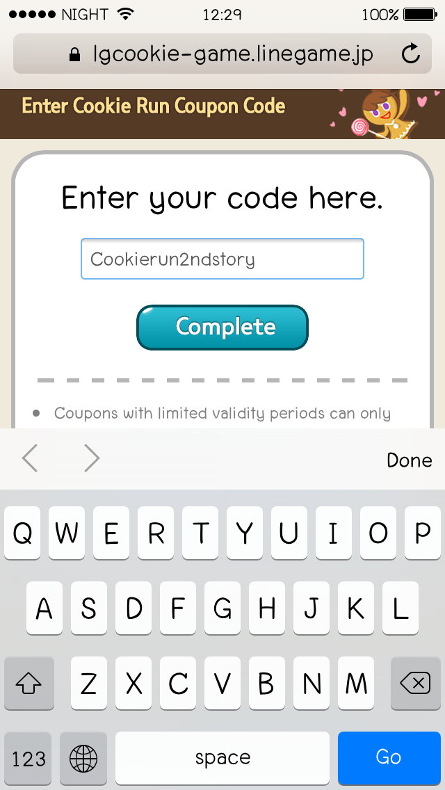 เราจะเด้งมายังหน้าจอบราวเซอร์ให้ใส่รหัส ซึ่งรหัสก็คือ Cookierun2ndstory ครับ พิมพ์เสร็จกด Complete ได้เลย เท่านี้ก็ได้มา 100 คริสตัลฟรีๆ ละ แต่ยังเหลืออีกกิจกรรมคือการชวนเพื่อนมาเล่น 50 คน เพื่อเอาอีก 100 คริสตัล
