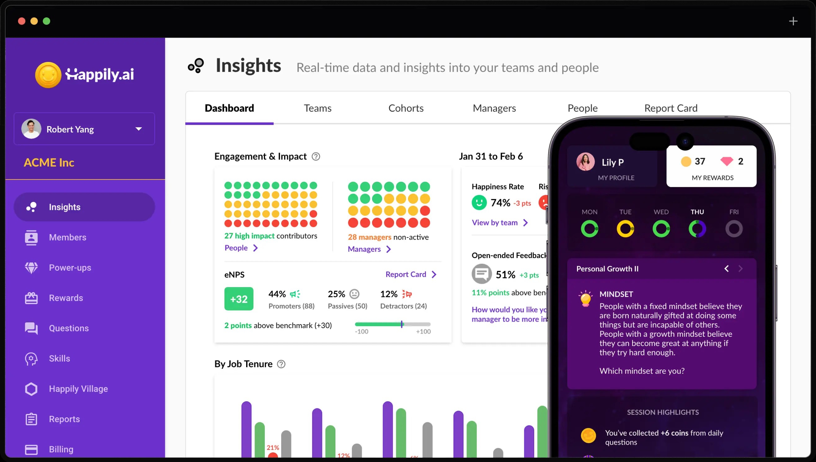ฝ่ายบริหารจัดการ สามารถเข้าถึงข้อมูลการวัดผลรายวัน จากทั้งการตอบคำถามและกิจกรรมการใช้งาน ซึ่งนอกจากจะวัดความสุขของพนักงานได้แล้ว ยังวัดได้ลึกถึงโครงข่ายความสัมพันธ์ของพนักงานต่อคนในที่ทำงานได้ระดับรายบุคคลได้เลยทีเดียว