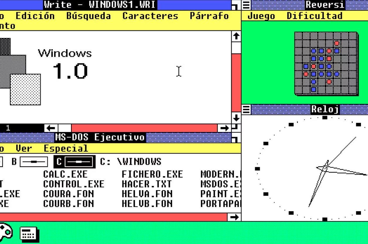 ในปี ค.ศ. 1985 (พ.ศ. 2528) Microsoft เปิดตัว Windows 1.0 เพื่อแข่งขันกับ Apple โดยมาในช่วงหลัง Lisa ก่อน Macintosh แต่มันก็ไม่ได้รับความนิยมเท่าไหร่นัก ซึ่งตัว Windows 1.0 ก็ไม่จัดว่าเป็นระบบปฏิบัติการด้วยซ้ำไป มันเป็นเพียงส่วนเสริมของ ระบบปฏิบัติการ MS-DOS ที่เพิ่มองค์ประกอบเข้ามาหลายอย่างเช่น เครื่องคิดเลข, ปฏิทิน, Notepad, Paint, Reversi, Terminal และ Write โดยใน Windows 1.0 หน้าต่างยังไม่สามารถเรียงทับซ้อนกันได้ด้วยซ้ำ แต่ละหน้าต่างจะเรียงต่อกันแบบ Tiled (แผ่นกระเบื้อง)