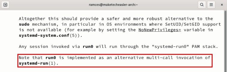 Run0 นำเสนอแนวคิดใหม่ที่แตกต่างในการยกระดับสิทธิ์สำหรับ Linux โดยใช้ Systemd-run เพื่อสร้างสภาพแวดล้อมที่ปลอดภัย และแยกต่างหากสำหรับการรันโปรแกรมด้วยสิทธิ์ "root" ข้อได้เปรียบหลักของ Run0 คือมันไม่พึ่งพา "setuid (SUID)" ในการรันคำสั่ง root ทำให้โปรแกรมนี้ปลอดภัยจากการโจมตีเพื่อยกระดับสิทธิ์ที่มักเกิดกับโปรแกรม SUID ขนาดใหญ่