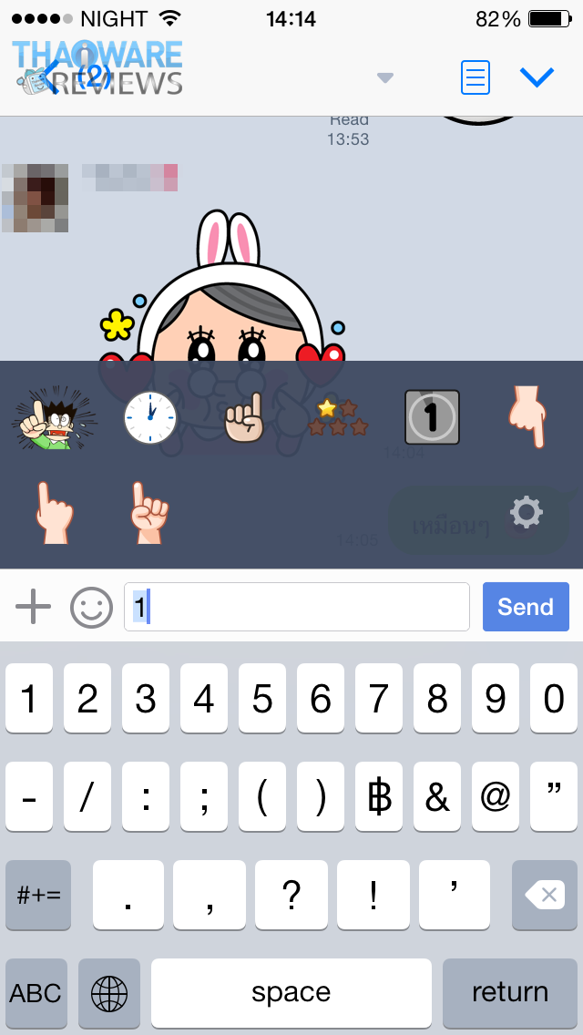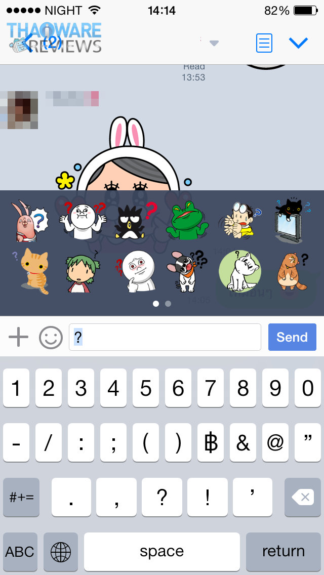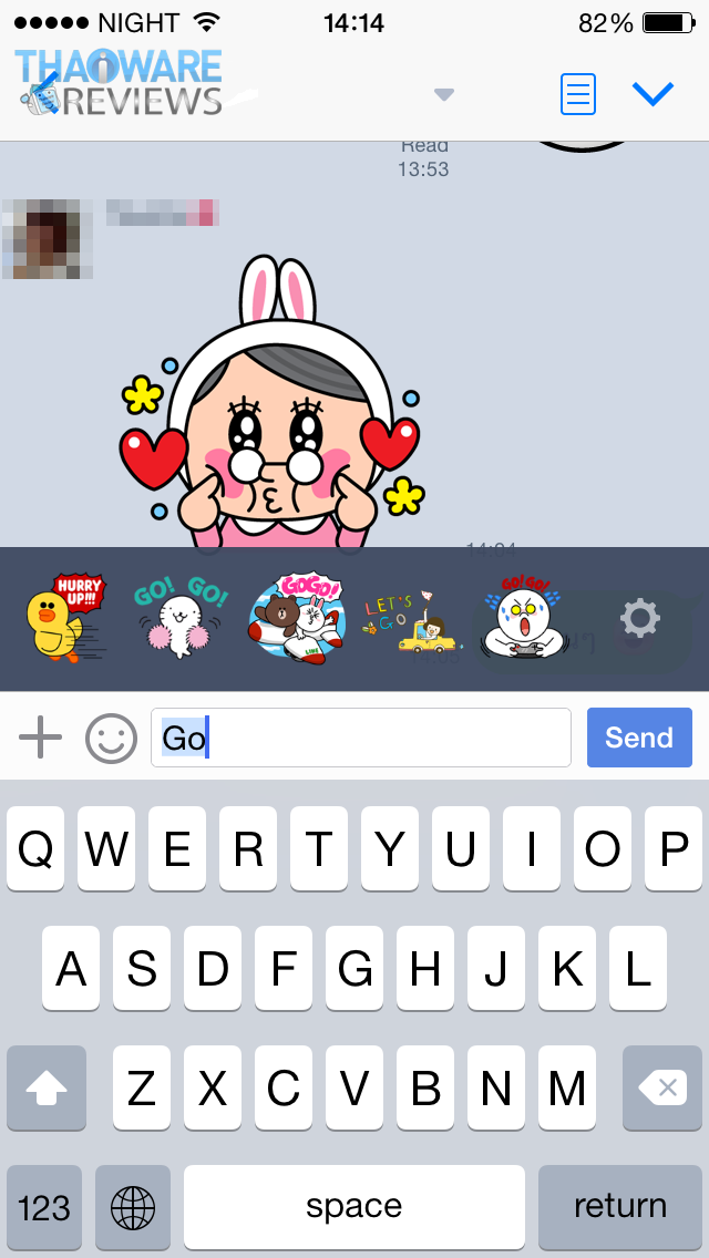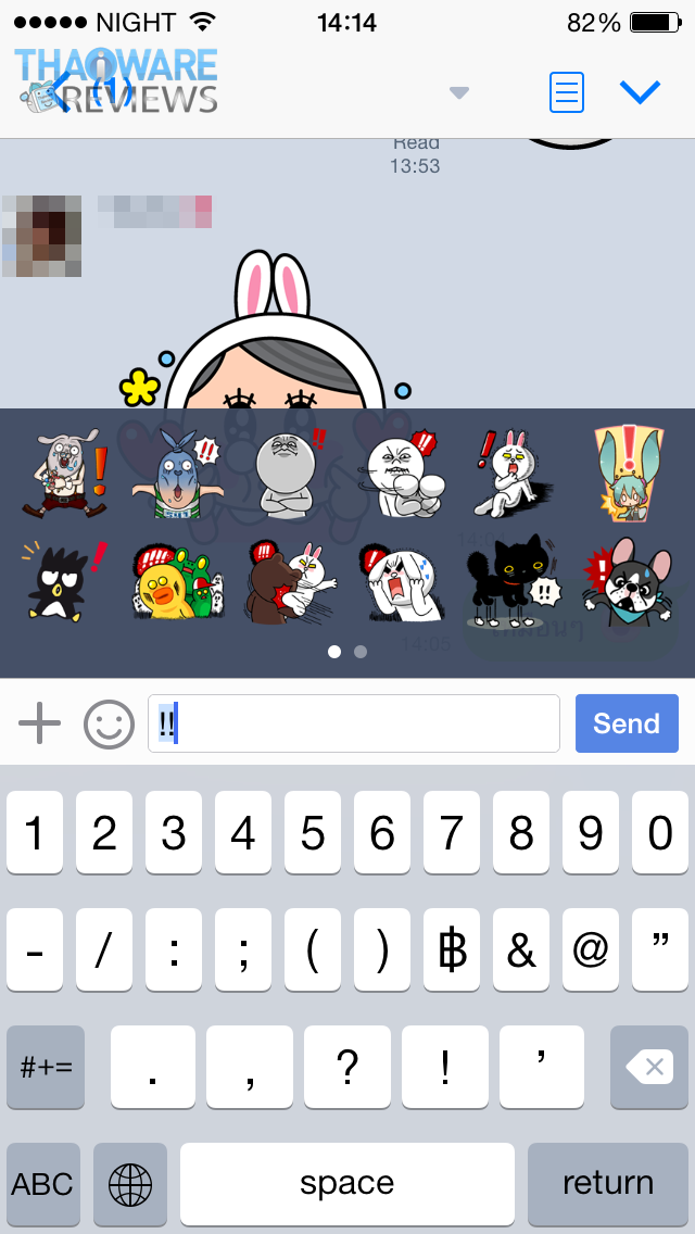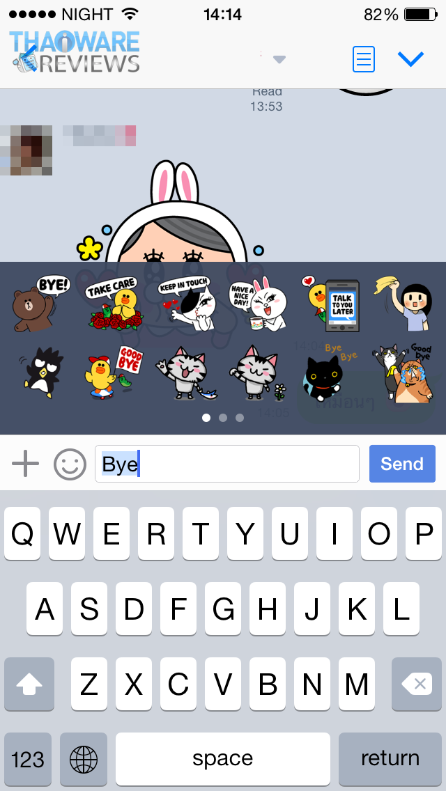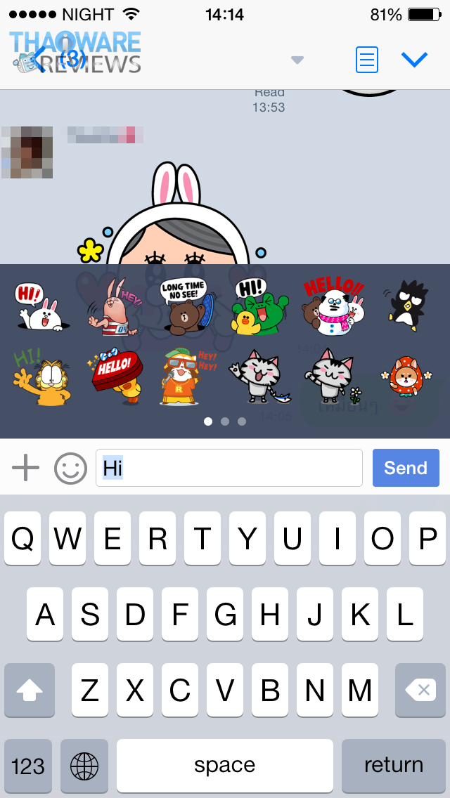 LINE จะใส่ "TAG" เอาไว้ในแต่ละสติกเกอร์ เมื่อเราพิมพ์คำที่เป็น TAG สติกเกอร์ก็จะปรากฏออกมาเหนือคีย์บอร์ดทันที ลองดูภาพประกอบ เมื่อผมพิมพ์คำว่า Hi สังเกตว่าสติกเกอร์ที่เกี่ยวข้องกับคำว่า Hi จะปรากฏออกมาทันที หรือบอกลาก็พิมพ์คำว่า Bye