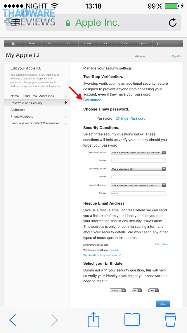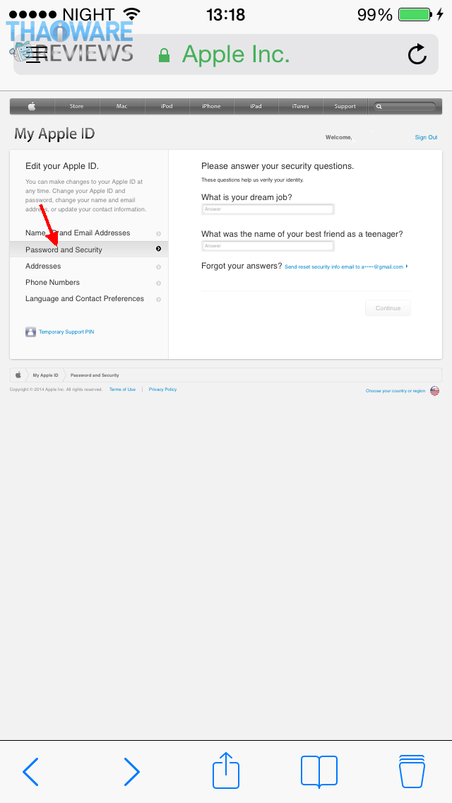 เราจะถูกพามายังหน้าเข้าระบบใน Safari กด Sign In เข้าไปแล้วเลือกที่ Password and Security เราจะต้องตอบคำถาม Security question ให้ถูกต้อง คำถามนี้คือคำถามที่เราตั้งไว้ตอนสมัคร Apple ID ครั้งแรก