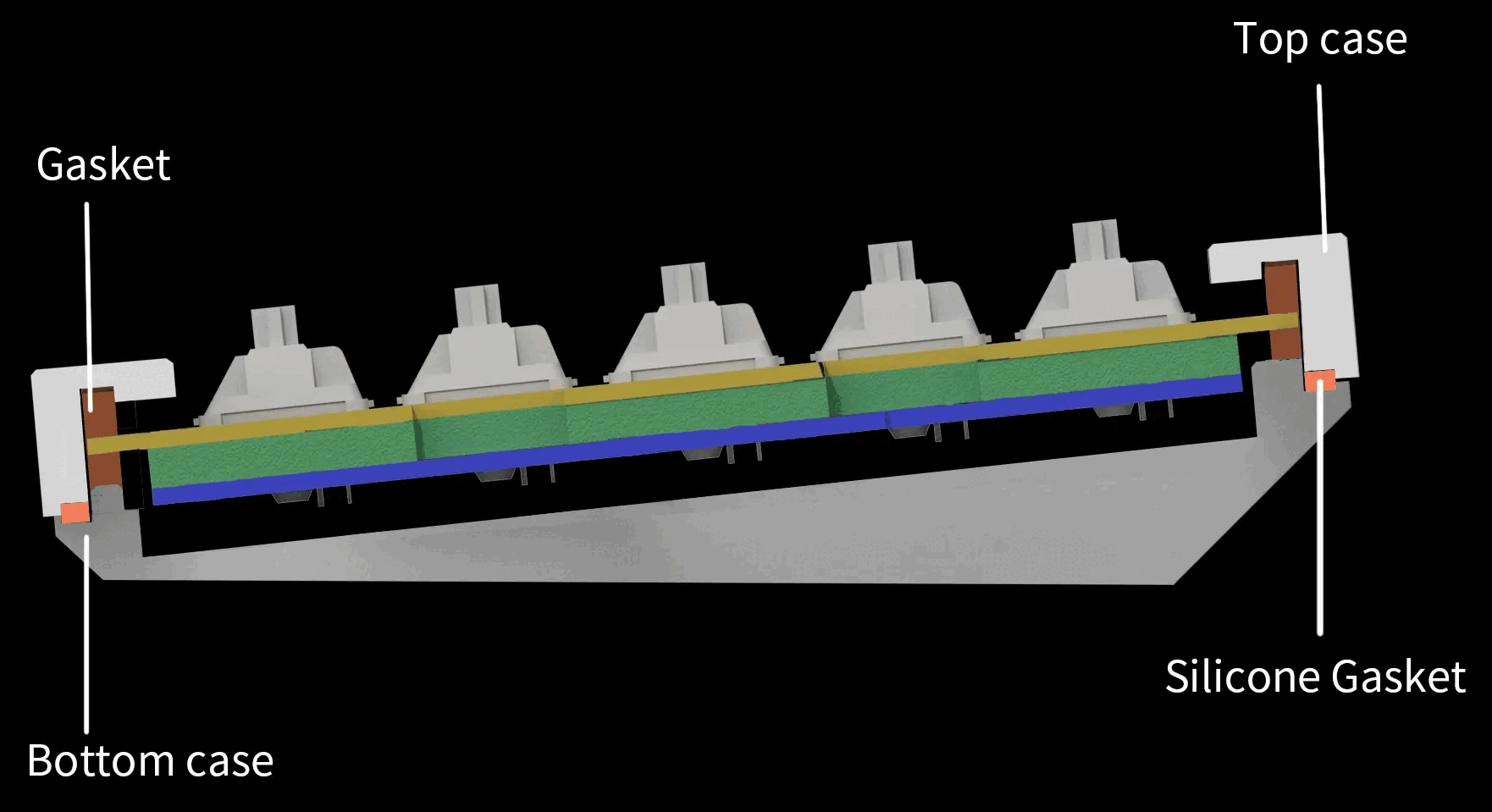 สุดท้าย Gasket Mount นี่เป็นรูปแบบที่กำลังมาแรง ได้รับความนิยมอย่างมากในปัจจุบันนี้ โดยวิธีการนี้จะมีการนำวัสดุที่มีคุณสมบัติยืดหยุ่นเข้ามาช่วยดูดซับแรงกระแทก ระหว่างแผ่นรอง กับตัวเคส ทั้งด้านบน และด้านล่าง