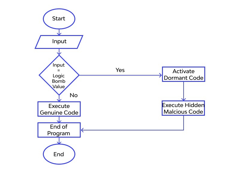 เมื่ออุปกรณ์ หรือระบบของเหยื่ออยู่ในสภาวะครบเงื่อนไข หรือสถานการณ์ที่ทาง Logic Bomb ถูกตั้งโปรแกรมเอาไว้ ซึ่งอาจเป็นเงื่อนไขที่เรียบง่ายอย่างการตั้งวันเวลาไว้ล่วงหน้า, เมื่อเปิดไฟล์ที่กำหนด หรือเมื่อมีอุปกรณ์ที่กำหนดมาเชื่อมต่อ Logic Bomb ก็จะเริ่มทำงานทันที