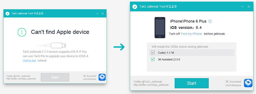 โปรแกรมจะทำการตรวจสอบเวอร์ชันของ iOS ถ้าเป็น iOS 8.3 ปุ่มด้านล่างจะเป็นสีฟ้า แต่อย่าเพิ่งรีบกด Start ครับ สังเกตว่าจะมีให้เลือก 2 ช่อง Cydia 1.1.16 กับ 3K Assistant ให้ติ้ก 3K (TaiG App Store) ออก