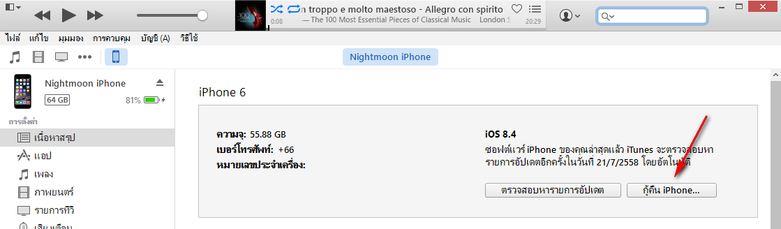 วิธีนี้ค่อนข้างง่าย และสะดวก ให้เราเปิด iTunes ขึ้นมา แล้วเลือก "กู้คืน iPhone..." ถ้าใช้เวอร์ชันภาษาอังกฤษจะเป็น "Restore iPhone..."