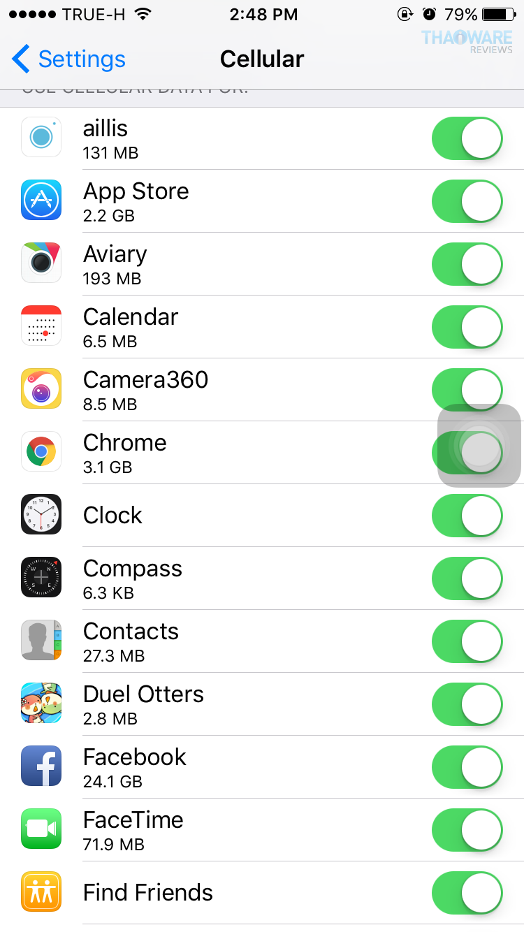 แอปฯ หลายตัวมีการใช้ปริมาณ Data สูงมาก หรือหากใช้น้อยแต่ถ้ามีหลายแอปฯ เยอะๆ รวมกันมันก็ใช้เยอะอยู่ ลองตรวจสอบได้ด้วยตนเองด้วยการไปที่ Settings >> Cellular >> USE CELLULAR DATA FOR: หากมีแอปฯ ไหน ที่เราไม่ค่อยได้ใช้งานหรือรู้สึกว่าไม่จำเป็นต้องต่ออินเตอร์เน็ต ก็ให้กดปิดไปเลย