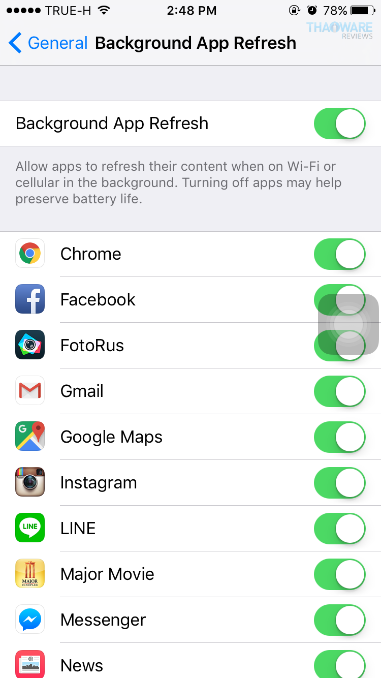 Apps บน iOS จะมีการอัปเดตข้อมูลอย่างสม่ำเสมออยู่เบื้องหลัง แต่บางแอปฯ หากคิดว่าไม่จำเป็นต้องอัปเดตเบื้องหลังก็ได้ เราก็ปิดได้ ให้มันอัปเดตเฉพาะเวลาที่เราต้องการใช้งานแอปฯ นั้นๆ ก็พอ